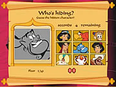 In this game you are Aladdin from the Disney's cartoon. You're flying on the flying carpet and enter various floors of the tower. There's a quest you must solve on each floor. There'll be several characters from Aladdin cartoon to your right and a rectangle to your left. Small pieces of the rectangle will be revealed. Your goal is to guess what character is hidden there and select this character in the right-hand part. If you can't do it before the time is over, you lose the game.