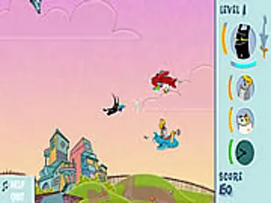 Blik, ever-mad for power is on the hunt for the remaining parts of the magical Swork. The parts he already has have give him the power to fly. Squirt at Gordon and Waffle to get their Swork parts. Be sure to grab Swork pieces before they reach the ground or your opponent will get a shiny new plane and come after you again. If you hesitate in grabbing the Swork pieces, Grizzled will come puttering after you. Squirt him to stop his attacks.