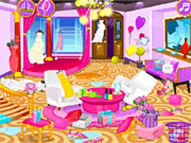 Iemand heeft zojuist de Trouwsalon vernield. We kunnen het maar beter schoonmaken voordat de klanten arriveren! Pak al het afval op en gooi het weg. Maak de muren schoon en dweil de vloeren. Verwijder de spinnenwebben en herschik alle meubels!