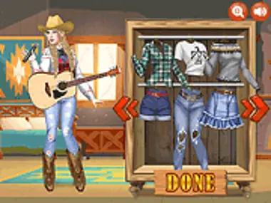 Ze ambieert een countrypopster te worden, maar ze heeft de perfecte look nodig voor countrypopoutfits. Help haar zich klaar te maken voor de countrytour met een jurkenensemble in zuidelijke stijl. Mix en match verschillende unieke combinaties van jurken, laarzen, hoeden, tops en accessoires om te passen bij een 'southern belle' vrouw met muzikaal talent! Veel plezier met het spelen van dit meidenspel hier op Y8.com!