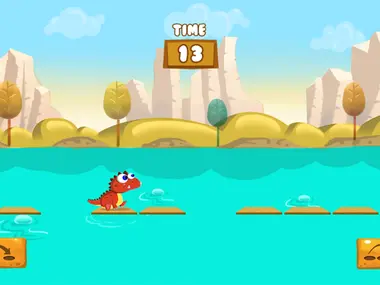 Spring van het ene platform naar het andere. Hoe ver denk jij dat je kunt springen? Dino Jump is een leuk en spannend platformspel waarin je kunt testen hoe snel je reageert en welke sprong je gaat maken. Probeer de bonustijd te pakken en val niet in het water.