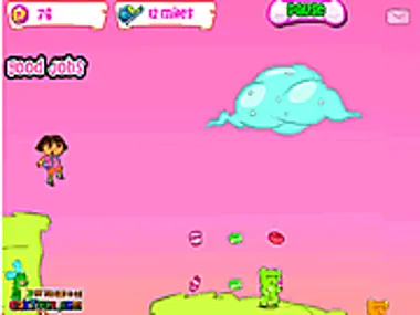 Dora verkent het gummy land, verzamel snoepjes om je uiterlijk te upgraden, spring over de gummibeer om hem te laten knappen, ren zo snel mogelijk om niet gepakt te worden door het monster!