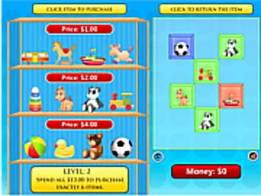 Go Shopping is a Mathematics skill based puzzle game where you need to spend all of your money to purchase a fix number of toys.