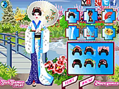 Geisha, deze traditionele Japanse entertainers staan bekend om hun schoonheid en talent in de kunsten van muziek, dans en spellen. Eén van de mooiste Japanse geisha's maakt nu een mooie wandeling in de bloeiende Japanse tuin. Altijd gekleed in een kimono en accessoires zoals waaiers en parasols, heeft deze geisha jouw hulp nodig bij het kiezen van de mooiste van allemaal. Bekijk de kimono's in haar garderobe en al haar accessoires en kleed haar aan. Vergeet niet het kapsel met alle juwelen. Veel plezier!