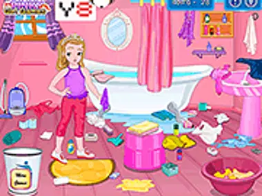 Kleine prinses is vandaag verdrietig omdat haar kamermeisje vrij heeft en haar badkamer al dagen niet is schoongemaakt. Ze kreeg een telefoontje van haar goede vriendin dat ze morgen langs zou komen om haar te ontmoeten. De kleine prinses kan het schoonmaken niet alleen doen. Ze heeft jouw helpende hand nodig. Verzamel het afval en plaats het in de vuilnisbak. Zet de spullen terug op hun plek. Doe de vuile was in de mand. Dweil de vloer als dat nodig is. Hartelijk dank voor het helpen van de prinses.
