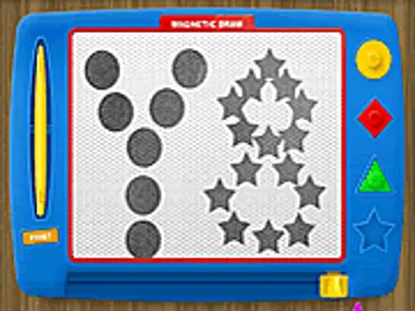 Gebruik de magnetische pen en vormen om een coole creatie te bedenken! Schuif de gele wisser onderaan om het scherm leeg te maken en
