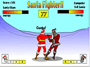 Basically the idea of the game is to beat up the very nasty evil Santa, who wants to take over Christmas and stop people enjoying Christmas. There are 10 levels of evil Santas to beat your way through. They start wimpy, but they very soon become accomplished fighters. Survive for as long as you can! As for rules, there aren't any, just hit kick and beat those nasty Santas. You get more points for punching him, rather than kicking, although the crouching sweep kick, can sometimes be the only way to get out of bother.