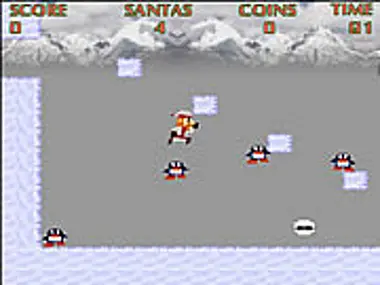 Run and jump as you hit presents like Mario with your head and turn into Santa and throw snowballs.