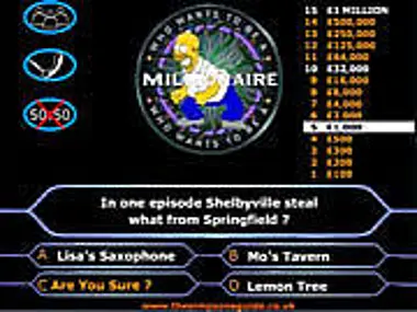 Simpson's Millionaire is a classic Flash quiz game that challenges your knowledge of the beloved Simpsons universe. Modeled after the "Who Wants to Be a Millionaire?" format, players must answer increasingly difficult questions about characters like Bart, Homer, Lisa, and the rest of Springfield’s quirky residents. With each correct answer, you climb closer to the million-dollar prize. Featuring simple mouse controls and a fun parody twist, this game is perfect for fans of The Simpsons and trivia lovers alike. Are you wise enough to reach the final question?