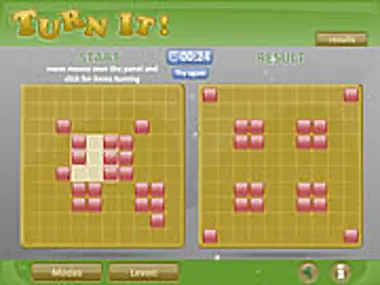 Logica- en hersentrainingsspel!!! Vóór de start van het spel, selecteer een spelitem waarmee je prettig speelt, en kies dan één van de drie mogelijke speltypes. Elk speltype heeft 24 moeilijkheidsniveaus en een verschillend aantal spelitems dat gedraaid kan worden. Het speelveld bestaat uit twee panelen: START en RESULTAAT. Het doel is om alle spelitems in het START-paneel, door ze te draaien, zo te plaatsen dat ze overeenkomen met hoe ze in het RESULTAAT-paneel staan. Je draait de items met de muis. Beweeg de muis over een item en klik erop om het te draaien.