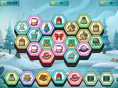 Winter Hexa Stack is een leuk match-3 puzzelspel met zeshoekige tegels, geplaatst in een besneeuwde winterwereld. Combineer drie of meer identieke items om het bord leeg te maken, sterren te verdienen en door steeds uitdagender levels te komen. Speel het Winter Hexa Stack spel nu bij Y8.